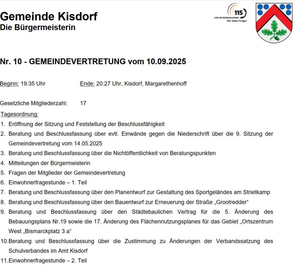 Die Mitglieder der Gemeindevertretung Kisdorf wurden durch schriftliche Einladung vom 06.09.2018 auf Donnerstag, den 20.09.2018, unter Zustellung der Tagesordnung einberufen. Zeit, Ort und Tagesordnung der Sitzung wurden öffentlich bekannt gemacht. Die FDP-Fraktion beantragt die Erweiterung der Tagesordnung um den TOP „Stopp der Ausschreibung