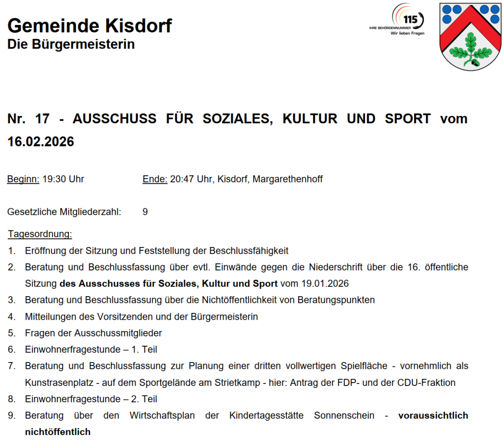 Protokolle Ausschuss für Jugend, Soziales, Kultur und Sport der Gemeinde Kisdorf