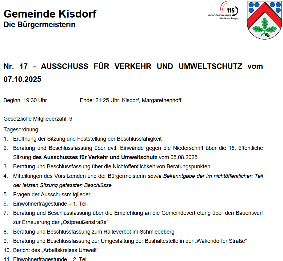 Protokolle Ausschuss für Verkehr und Umweltschutz der Gemeinde Kisdorf