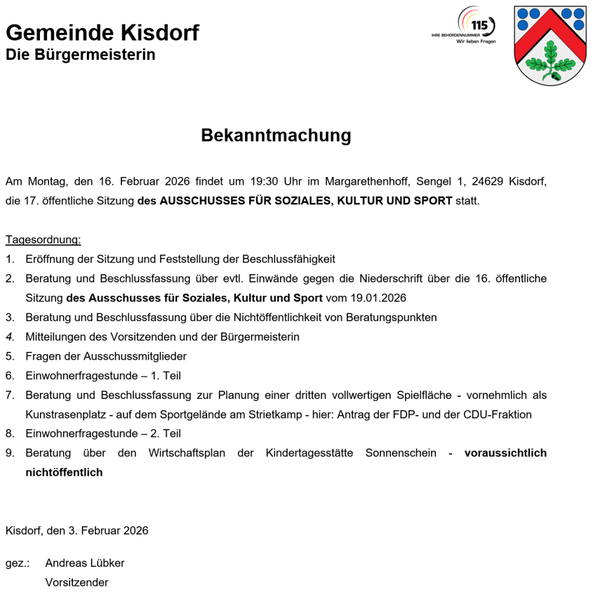 Erfreulicherweise war eine Belegung bisher nicht erforderlich, da dem Amt überraschend sehr viel mehr Wohnraum angeboten worden ist, als es die Erfahrungen aus der Flüchtlingskrise 2015 erwarten ließen. Aktuell bleiben jedoch Angebote von Immobilienbesitzern aus, so dass das Amt nun auf die Mehrzweckhalle in Kisdorf ausweichen muss. Die Halle bietet aufgrund ihrer zentralen Lage und der vorhandenen Räumlichkeiten mit einem Gemeinschaftsraum, einem Spielzimmer und den sanitären Anlagen gute Voraussetzungen für die Aufnahme der Schutzsuchenden. Diese Form der Unterbringung kann jedoch nicht von Dauer sein. Es wird daher an Lösungen mit langfristiger Perspektive gearbeitet.